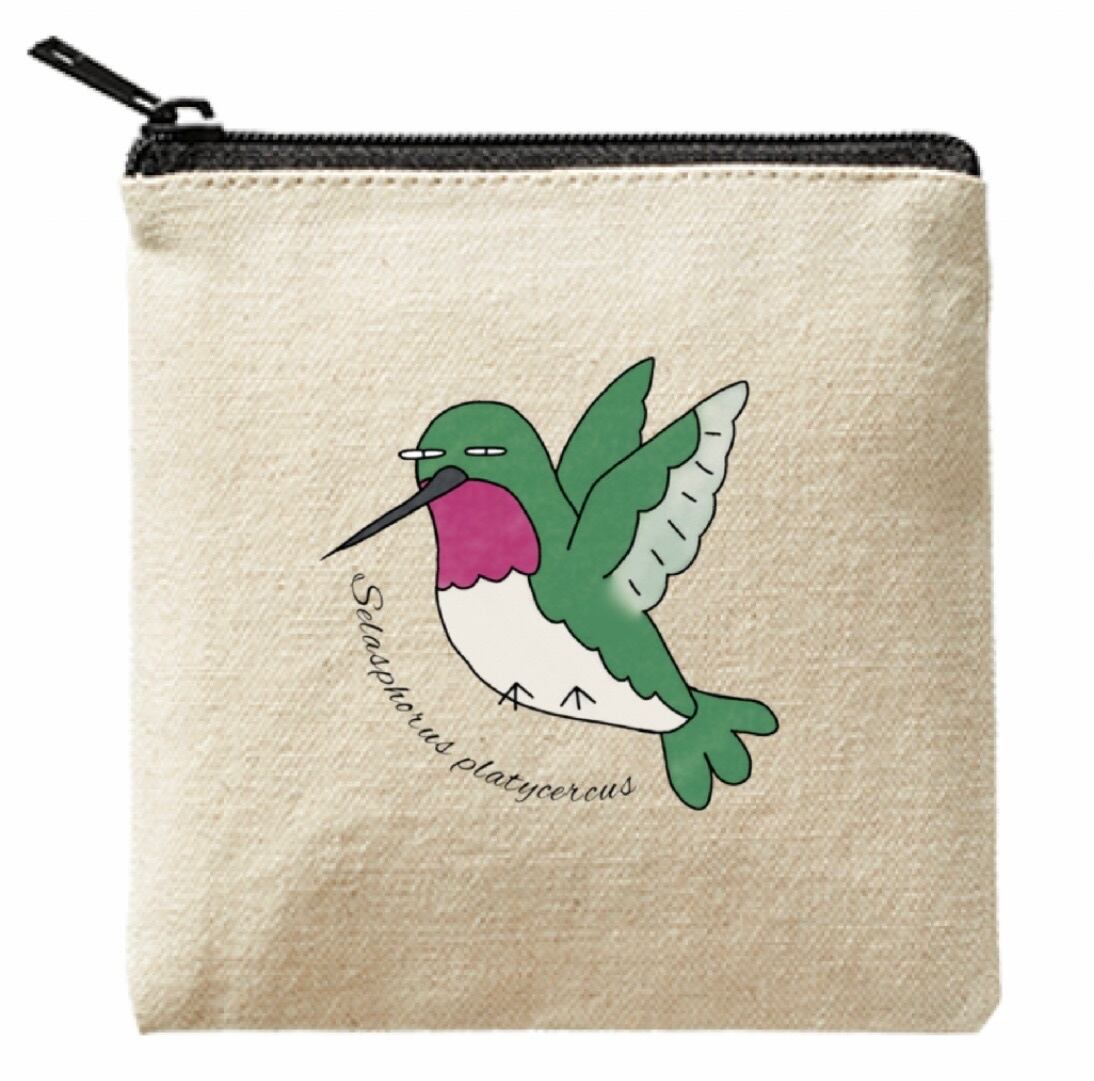 フトオハチドリさんのポーチはライトキャンバス生地で作られた可愛らしいアイテムです。学名が英語表記されており、オシャレで個性的なデザインが特徴です。13cmのスクエアポーチは小物や化粧品を収納するのにぴったりのサイズ感です。フトオハチドリさんの飛び回る姿が描かれたポーチは使うたびにワクワク感を与えてくれること間違いなしです。