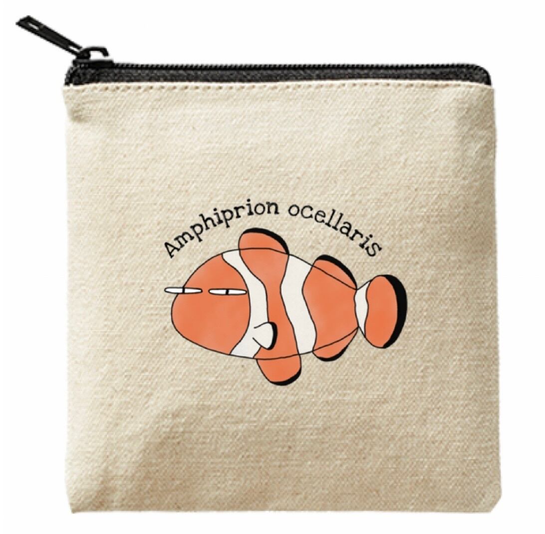 ライトキャンバス生地で作られたこの13cmのスクエアポーチは、サンゴ礁の間をすり抜けて泳ぐカクレクマノミさんをイメージしてデザインしました。見た目だけでなく、使い勝手も抜群!小物やメイク用品を整理整頓するのにぴったりです。