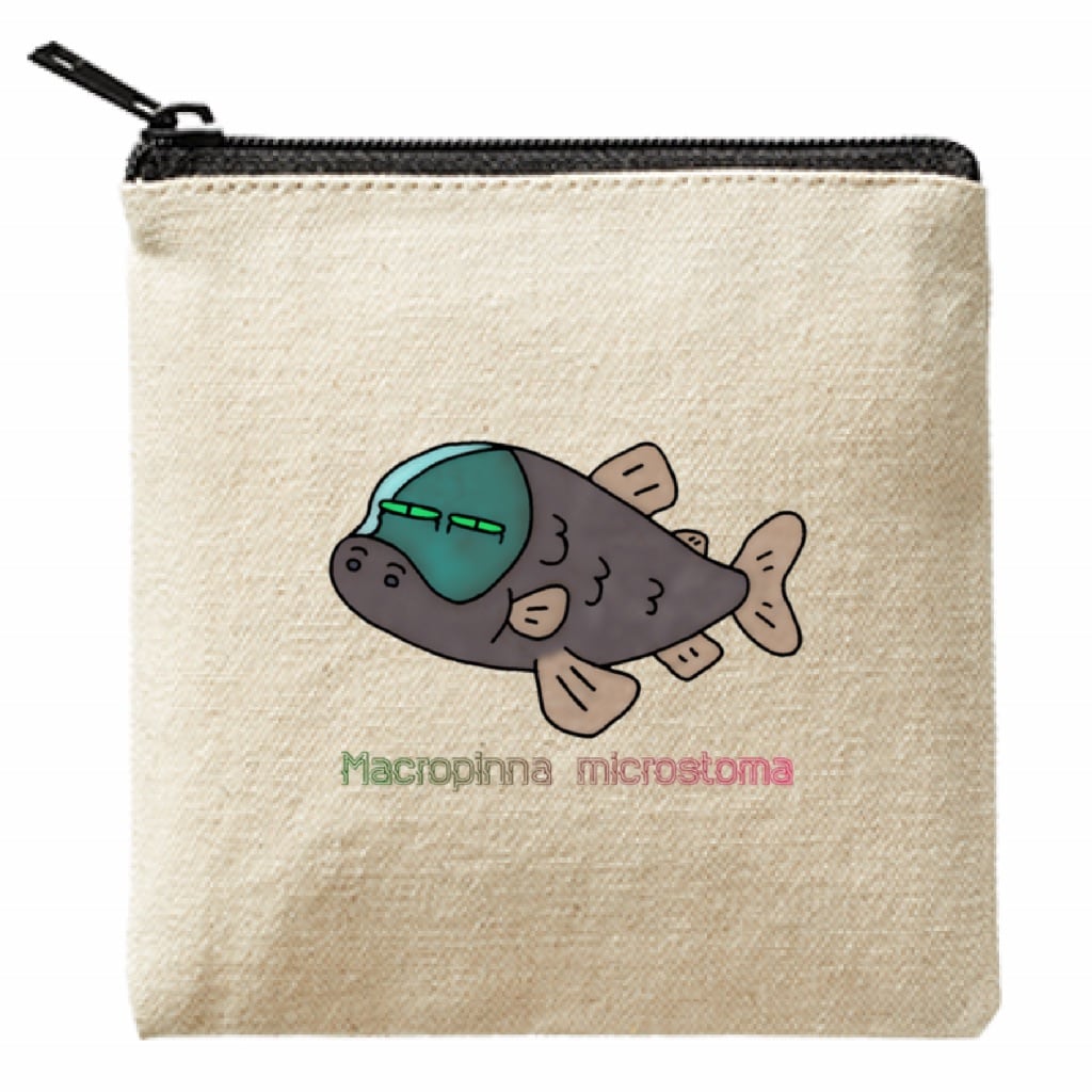 ライトキャンバス生地で作られた、丈夫で軽量な13cmのスクエアポーチは、デイリーユースから旅行まで幅広くご利用いただけます。学名を英語表記したユニークなデザインが、友達や家族に自慢できること間違いなし!そしてポーチの表面には、前を見ているのか上を見ているのかわからないデメニギスさんが描かれており、どことなく不思議な魅力が感じられることでしょう。メイク用品や小物などを収納しやすいサイズで、持ち運びにも便利です。