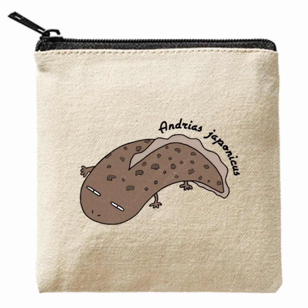 「オオサンショウウオさんのポーチ」はライトキャンバス生地で作られた13cmのスクエアポーチです。