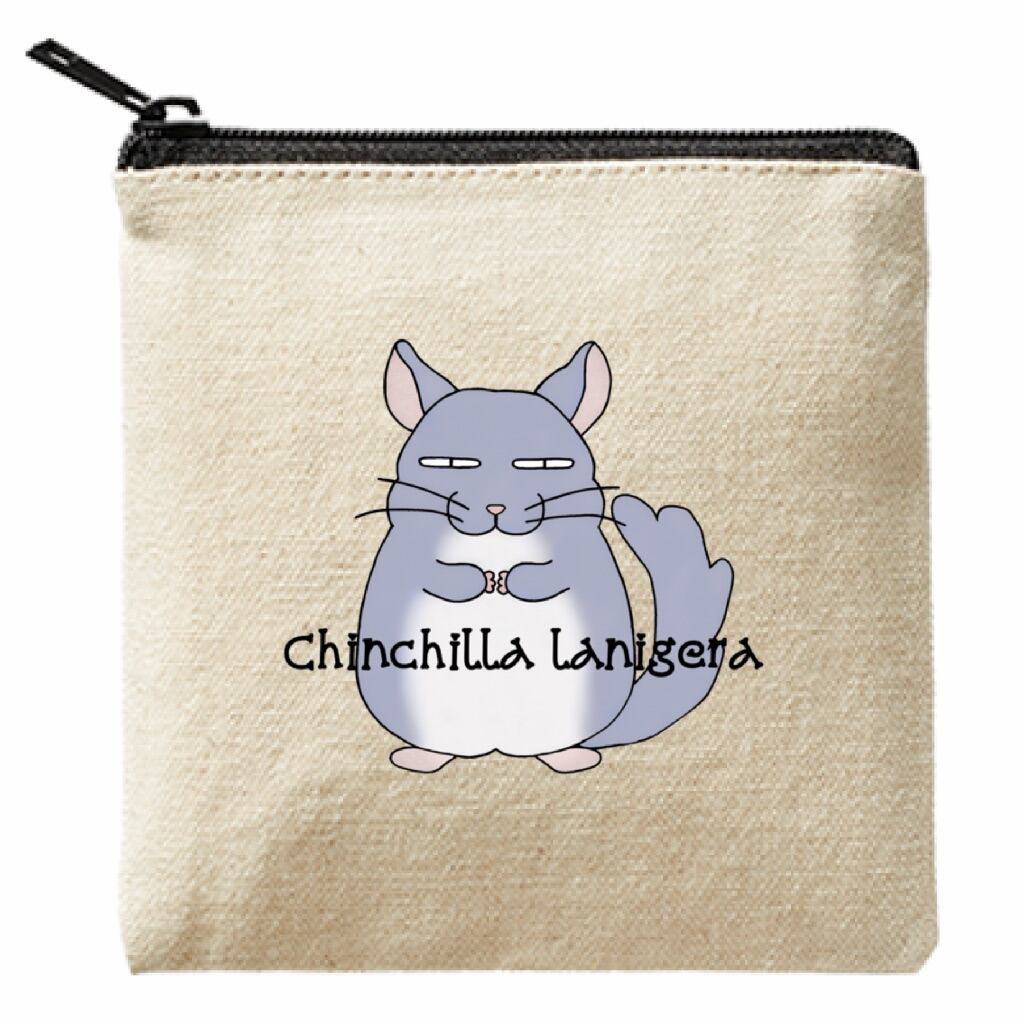 「チンチラさんのポーチ」はライトキャンバス生地で作られた13cmのスクエアポーチです。チンチラサンの愛でて欲しそうにこちらを見つめるつぶらな瞳が愛らしいアクセントとなっています。学名を英語表記したデザインもおしゃれなポイントとなっています。小物入れとして使ったり、バッグの中の整理にも役立つ便利なアイテムです。