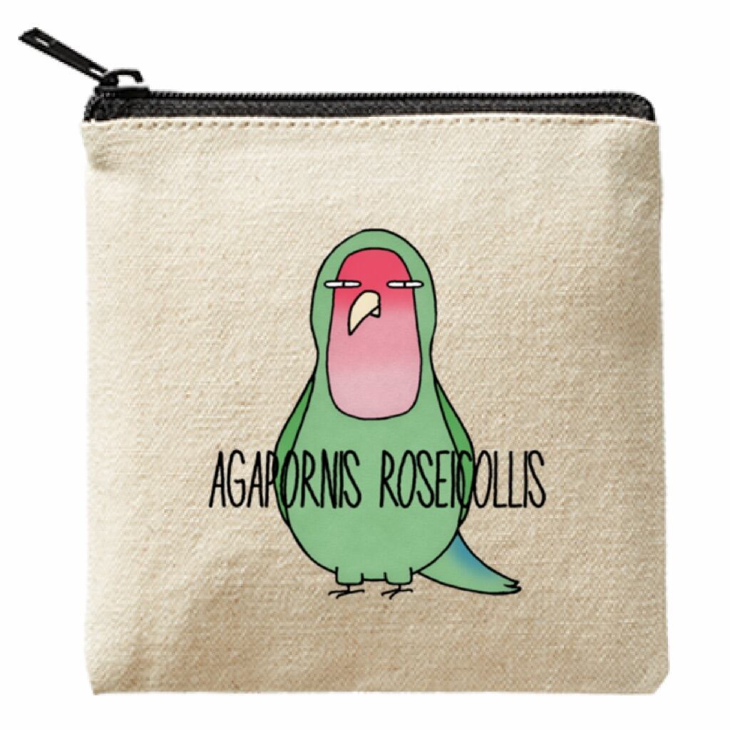 ライトキャンバス生地で作られたコザクラインコさんのポーチ。