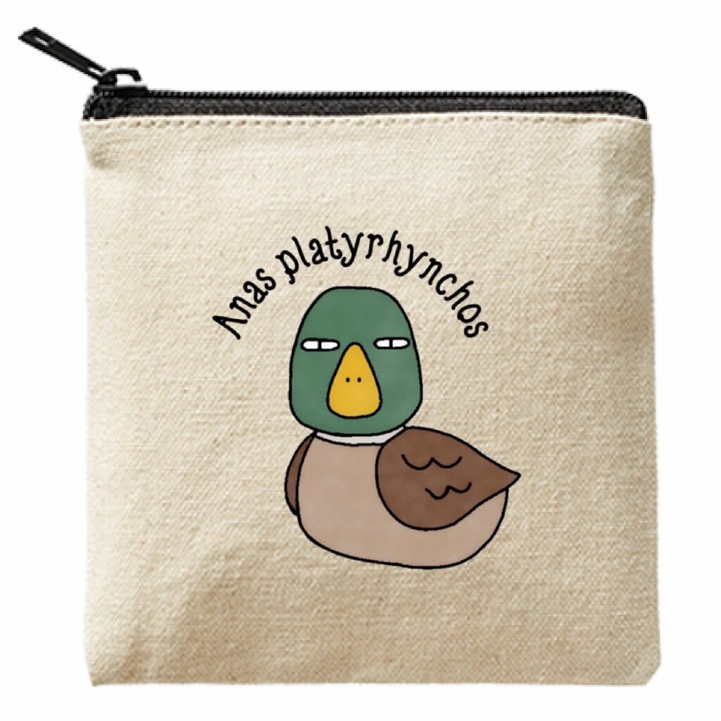 ポーチには学名を英語表記し、こちらをじーっと見つめながら水面を優雅に泳いでいるかのようなマガモさんのオリジナルイラストがプリントされており、見ているだけでほっこりとした気分になります。