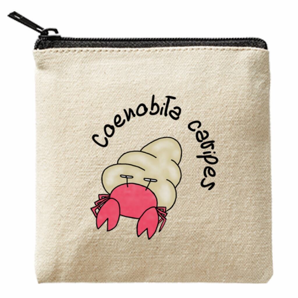 「オカヤドカリさんのポーチ」はライトキャンバス生地で作られた可愛らしい13cmのスクエアポーチです。ポーチにはオカヤドカリの愛らしい絵と学名を英語表記しており、自然愛好家や動物好きな方にも喜んでいただけるアイテムです。