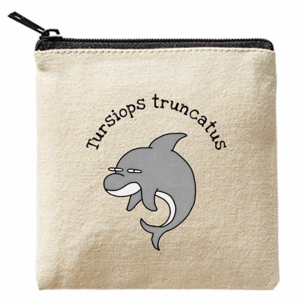 ライトキャンバス生地で作られたこの13cmのスクエアポーチは、可愛らしいグレーのバンドウイルカさんがおしゃれさを引き立てます。学名が英語で表記されているので、ちょっぴり頭の良さも感じられます。