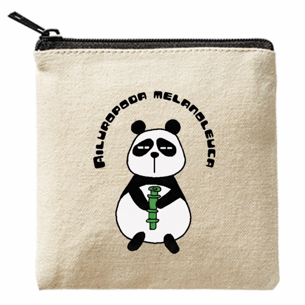 ライトキャンバス生地で作られたこの13cmのスクエアポーチは、学名を英語表記でプリントしています。ポーチにはのんびりと竹をムシャムシャ食べているジャイアントパンダさんの姿が描かれており癒しを求める方にぴったりのアイテムです。