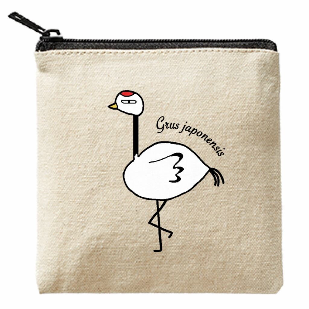 ライトキャンバス生地で作られたこのポーチは13cmのスクエアサイズで小物をしっかり収納できる嬉しいアイテムです。ポーチには頭頂部の赤がチャームポイントのタンチョウヅルさんがジャパネスク感を演出し、学名も英語表記されているのでちょっとしたおしゃれ感をプラスしてくれます。