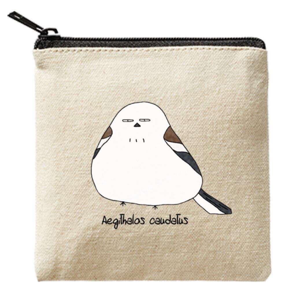 ライトキャンバス生地で作られたシマエナガさんのポーチ。学名を英語表記したユニークなデザインはファッションアイテムとしてもおすすめです。13cmのスクエアポーチは小物やメイクアイテムを整理するのに便利です。