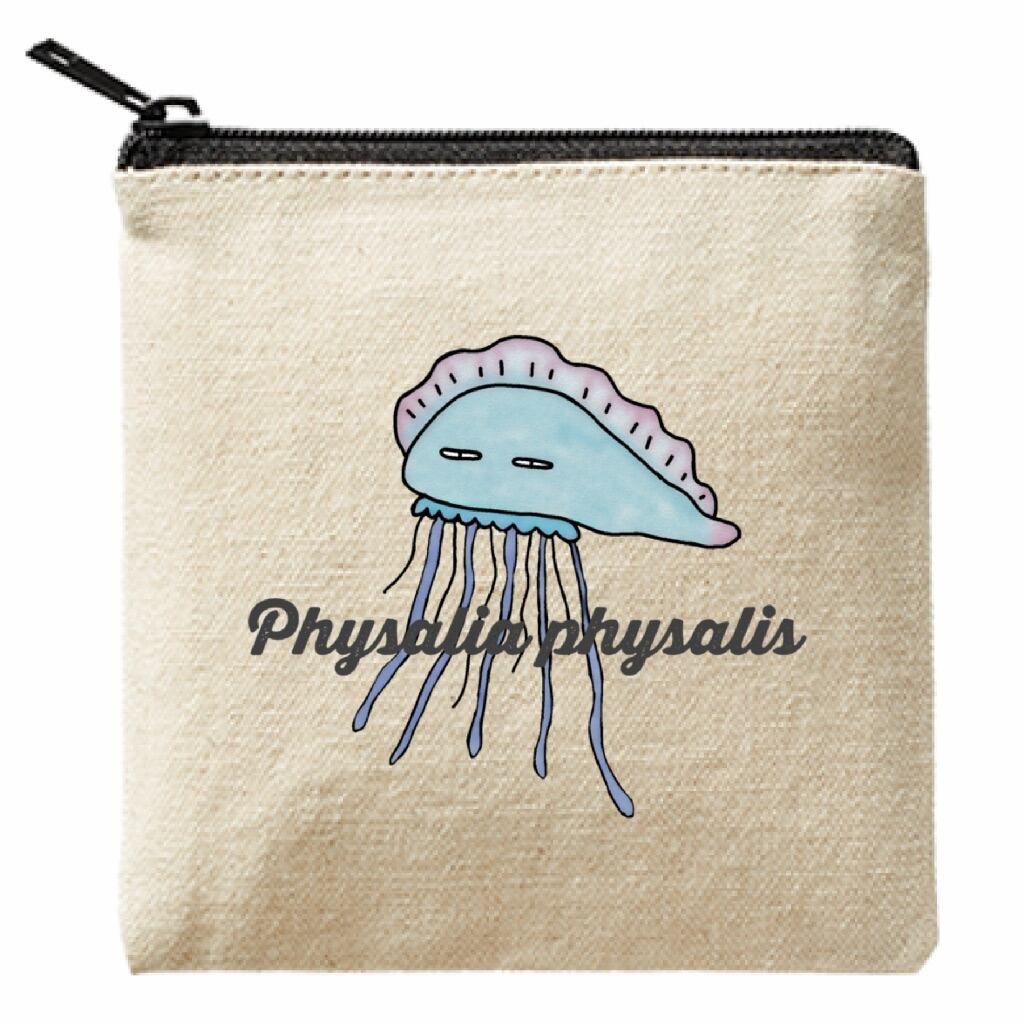 プリントされたカツオノエボシさんの学名「Physalia physalis」がクールな13cmのスクエアポーチ。