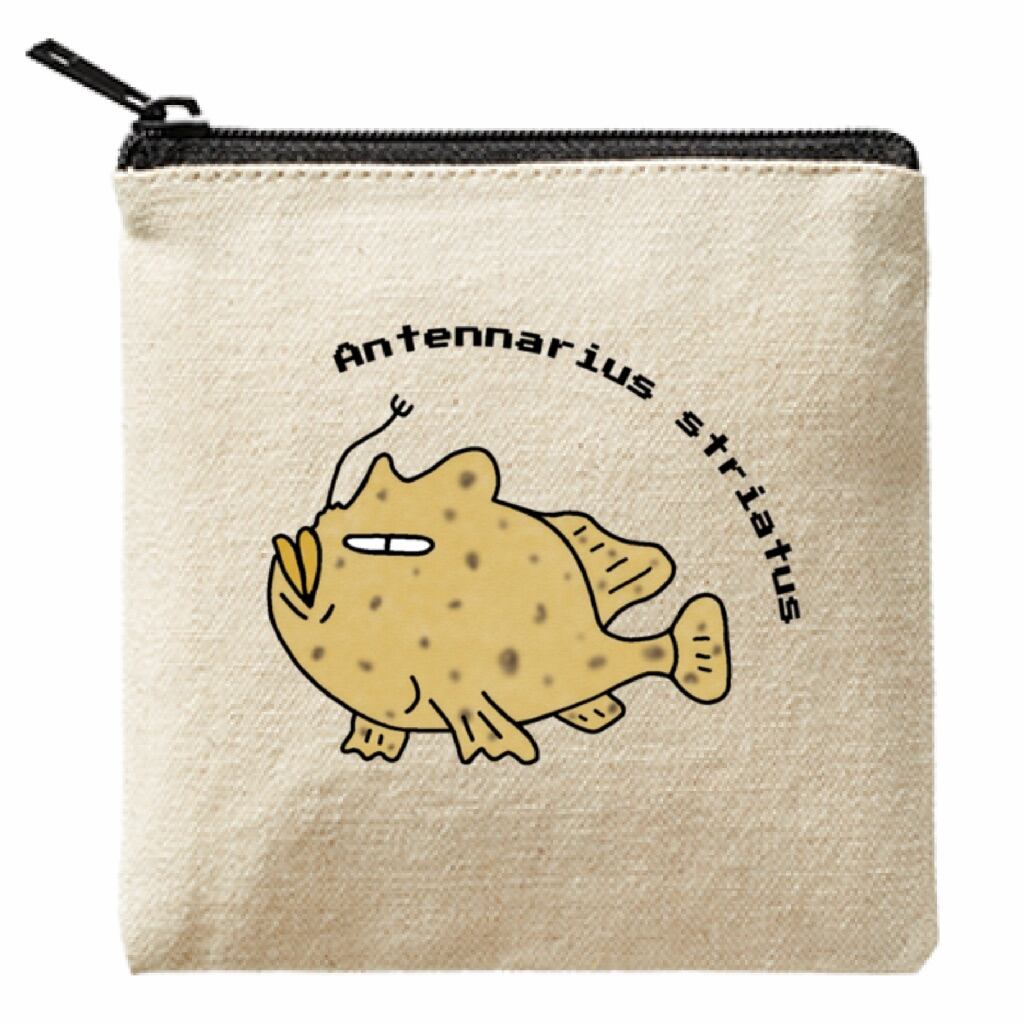 ライトキャンバス生地でできた13cmのスクエアポーチはコンパクトで持ち運びに便利です。ポーチの表面には、学名を英語表記したオリジナルデザインが施されており周りの注目を集めること間違いなし!カエルアンコウさんは泳ぎが苦手なので、足ヒレを使って歩き回ります。その姿が愛らしいポーチは、お出かけや旅行のお供にピッタリです。カラフルでポップなデザインがあなたの日常にユニークなアクセントをプラスします。